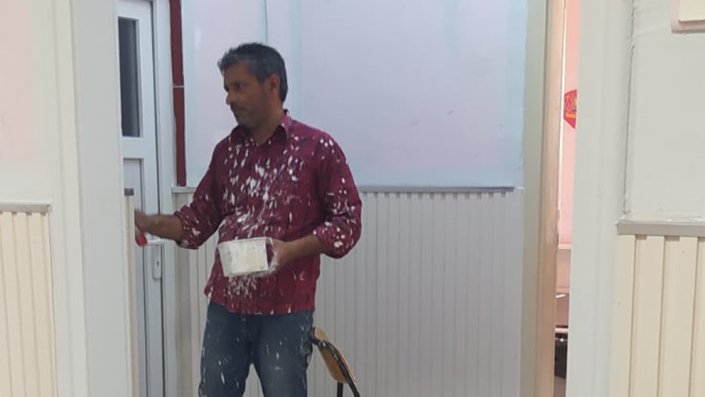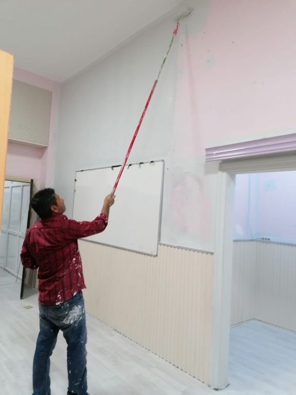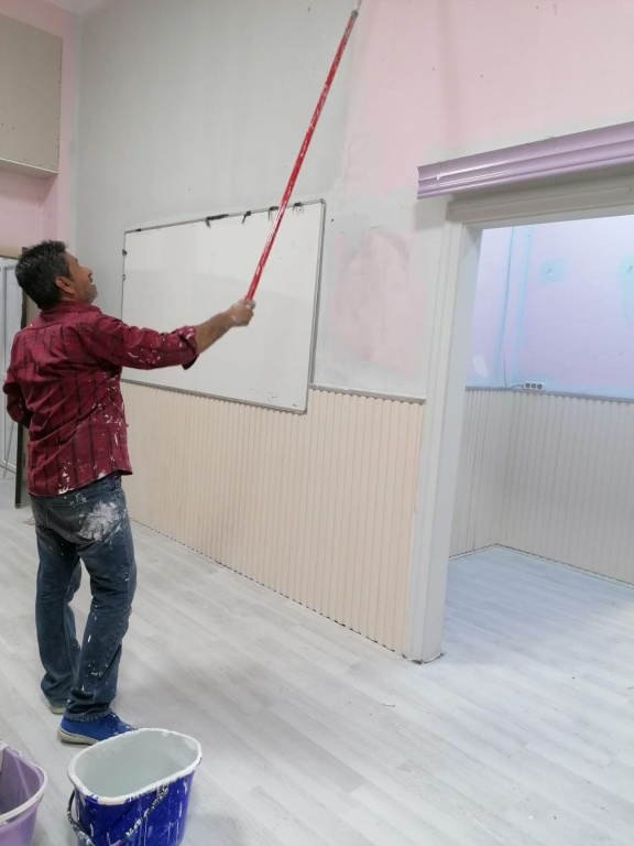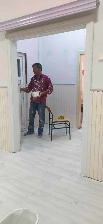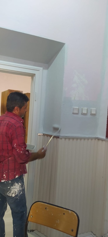 Okulumuzun anasınıfı,idare odaları ve giriş katını boyayan müdürümüz.